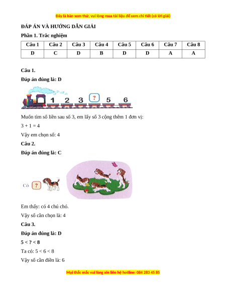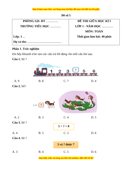 Em hãy khoanh tròn vào các câu trả lời đúng cho mỗi câu hỏi sau. Câu 1. Số ? A. 9 B. 8 C. 7 D. 4 Câu 2. Số? A. 2 B. 3 C. 4 D. 5 Câu 3. Số ? 5 < ? < 8 A. 4 B. 5 C. 2 D. 6 Câu 4. Số ? 3 và ? được 7 A. 3 B. 4 C. 5 D. 6