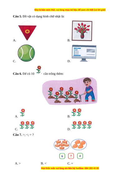 Câu 5. Đồ vật có dạng hình chữ nhật là: A. B. C. D. Câu 6. Để có 10 cần trồng thêm: A. B. C. D. Câu 7. >; <; = ? A. > B. < C. =