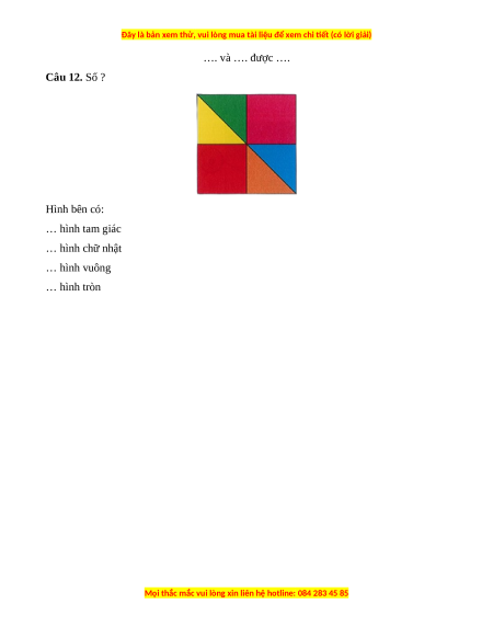 …. và …. được …. Câu 12. Số ? Hình bên có: … hình tam giác … hình chữ nhật … hình vuông … hình tròn