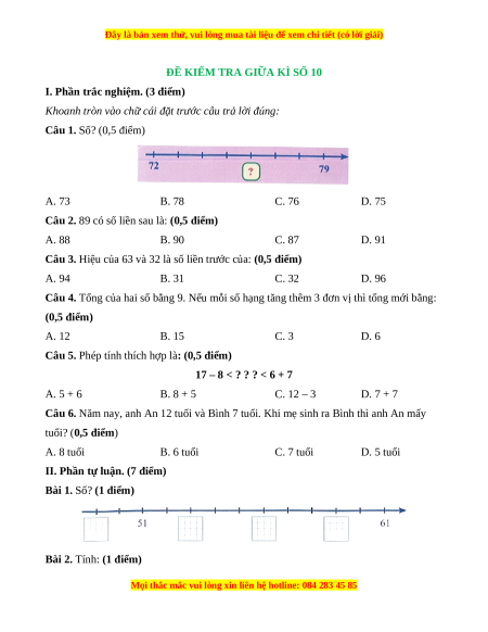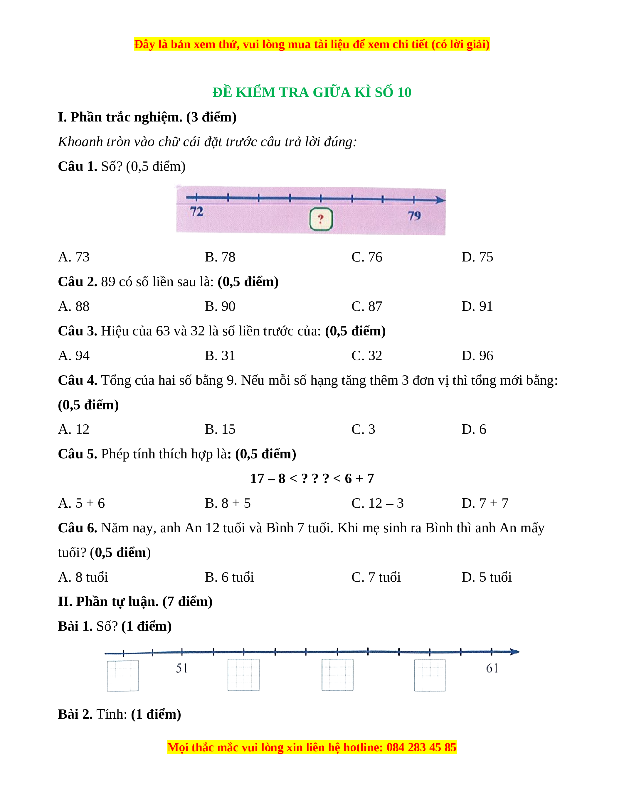 Câu 1. Số? (0,5 điểm) A. 73 B. 78 C. 76 D. 75