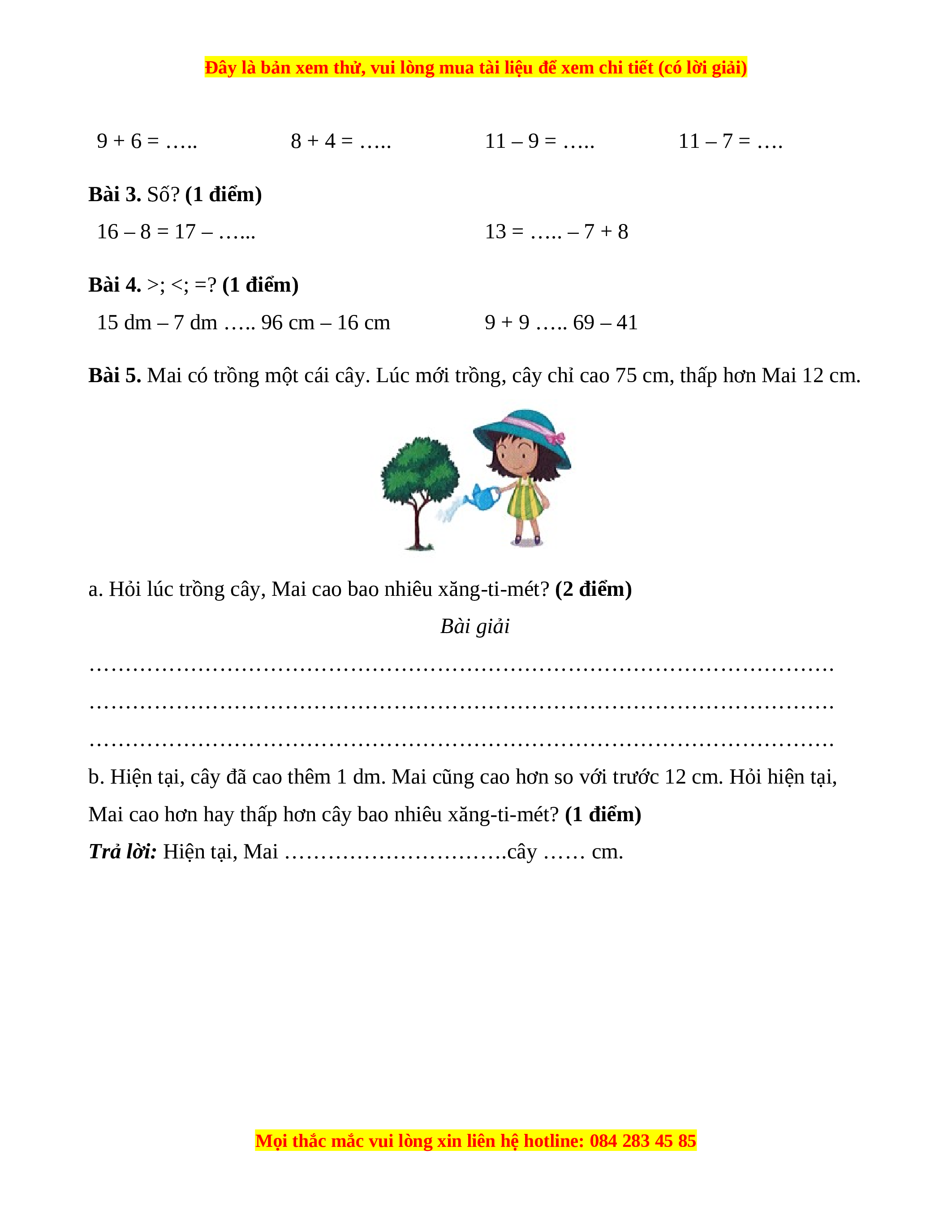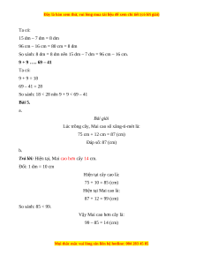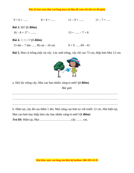 Bài 5. Mai có trồng một cái cây. Lúc mới trồng, cây chỉ cao 75 cm, thấp hơn Mai 12 cm.