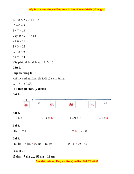 II. Phần tự luận. (7 điểm) Bài 1. Bài 2. 9 + 6 = 15 8 + 4 = 12 11 – 9 = 2 11 – 7 = 4 Bài 3. 16 – 8 = 17 – 9 13 = 12 – 7 + 8 Bài 4.