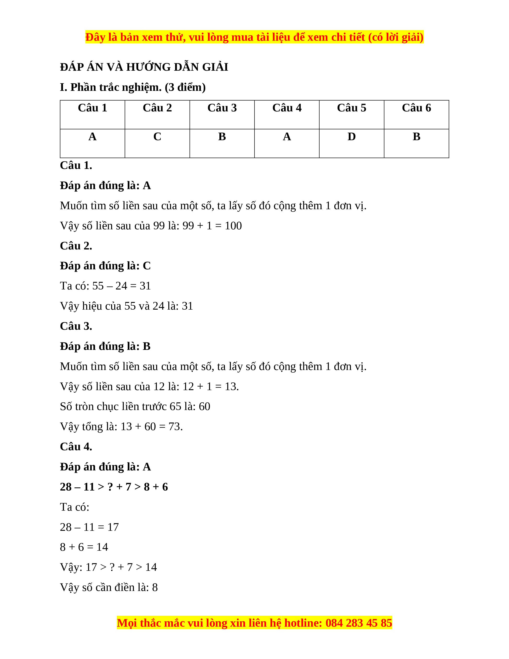 Vậy số liền sau của 99 là: 99 + 1 = 100 Câu 2. Đáp án đúng là: C Ta có: 55 – 24 = 31