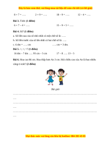 II. Phần tự luận. (7 điểm) Bài 1. Bài 2. 8 + 7 = 15 2 + 9 = 11 18 – 9 = 9 12 – 4 = 8 Bài 3. 6 + 7 – 4 = 9 15 – 9 + 5 = 11 Giải thích: 6 + 7 – 4 = …..