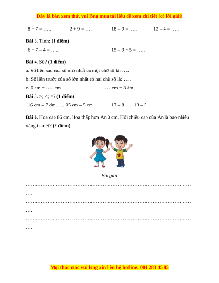 Bài 6. Hoa cao 86 cm. Hoa thấp hơn An 3 cm. Hỏi chiều cao của An là bao nhiêu