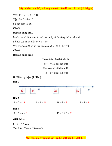 Vậy 69 là số liền trước của: 70. Câu 3. Đáp án đúng là: D 15 – 8 = 7 12 – 7 = 5 14 – 8 = 6 18 – 9 = 9