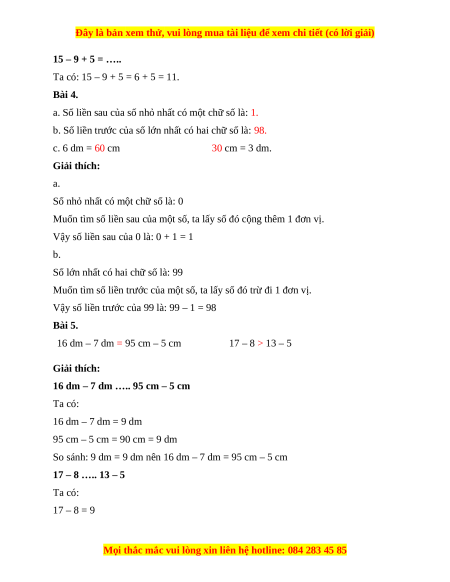 b. Số liền trước của số lớn nhất có hai chữ số là: ….. c. 6 dm = ….. cm ….. cm = 3 dm.