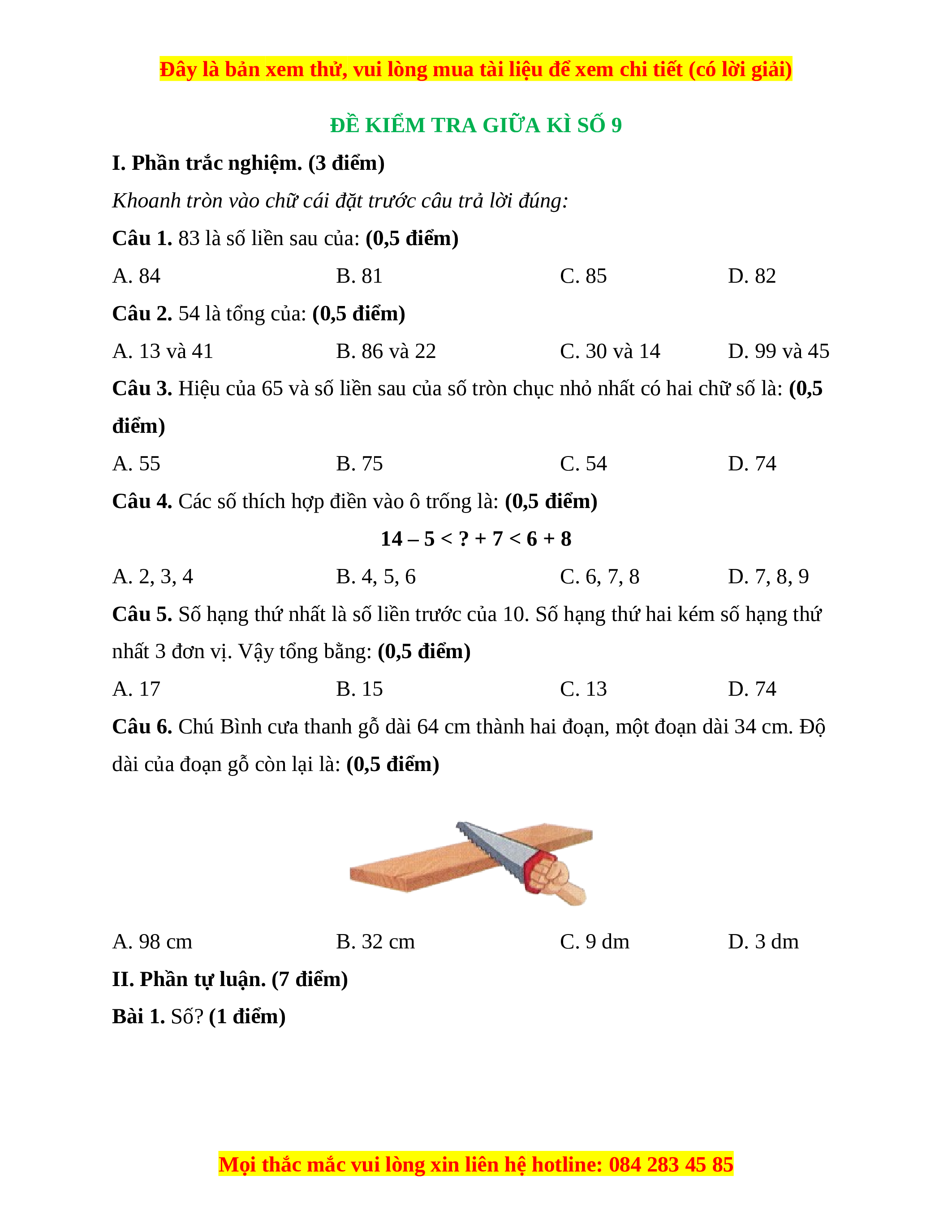 Câu 6. Chú Bình cưa thanh gỗ dài 64 cm thành hai đoạn, một đoạn dài 34 cm. Độ