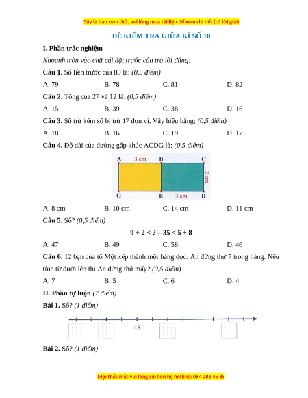 Câu 1. Số liền trước của 80 là: (0,5 điểm) A. 79 B. 78 C. 81 D. 82