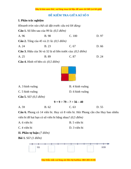 Câu 1. Số liền sau của 99 là: (0,5 điểm) A. 96 B. 98 C. 100 D. 97