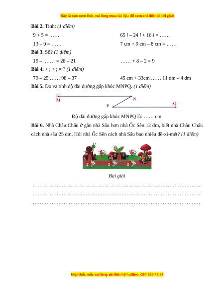 cách nhà sâu 25 dm. Hỏi nhà Ốc Sên cách nhà Sâu bao nhiêu đề-xi-mét? (1 điểm) Bài giải