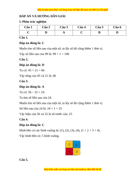 Vậy số liền sau của 99 là: 99 + 1 = 100 Câu 2. Đáp án đúng là: D Ta có: 45 + 21 = 66