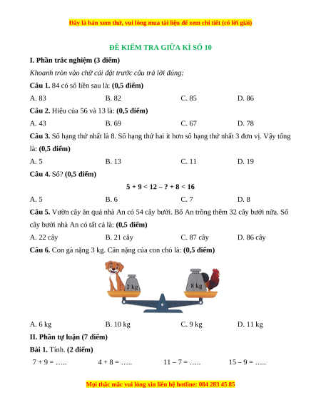 Câu 6. Con gà nặng 3 kg. Cân nặng của con chó là: (0,5 điểm) A. 6 kg B. 10 kg C. 9 kg D. 11 kg