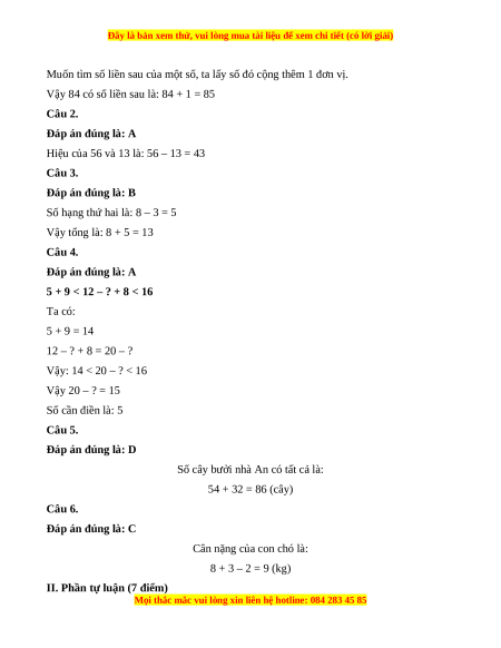 Vậy 84 có số liền sau là: 84 + 1 = 85 Câu 2. Đáp án đúng là: A