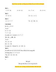 Bài 1. 7 + 9 = 16 4 + 8 = 12 11 – 7 = 4 15 – 9 = 6 Bài 2. 17 = 8 + 9 13 = 11 – 3 + 5 Bài 3. 9 + 5 = 7 + 7 76 – 21 > 89 – 51 Giải thích: 9 + 5 ….. 7 + 7 Ta có: 9 + 5 = 14 7 + 7 = 14
