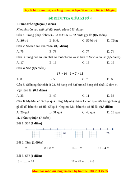 Câu 2. Số liền sau của 76 là: (0,5 điểm) A. 75 B. 78 C. 77 D. 74