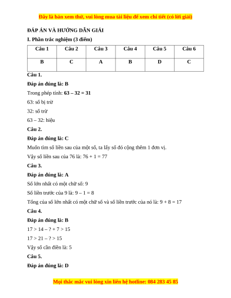 Câu 1. Trong phép tính: 63 – 32 = 31, 63 – 32 được gọi là: (0,5 điểm) A. Số trừ B. Hiệu C. Số bị trừ D. Tổng