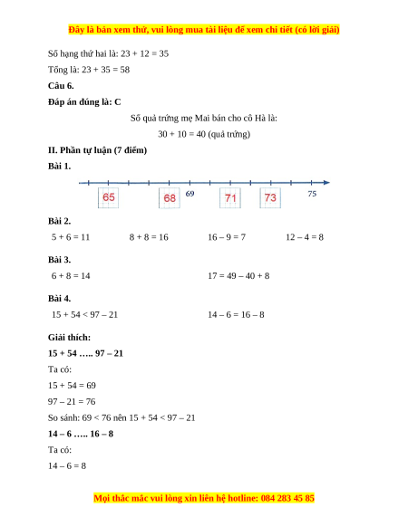 II. Phần tự luận (7 điểm) Bài 1. Bài 2. 5 + 6 = 11 8 + 8 = 16 16 – 9 = 7 12 – 4 = 8 Bài 3. 6 + 8 = 14 17 = 49 – 40 + 8 Bài 4. 15 + 54 < 97 – 21 14 – 6 = 16 – 8 Giải thích: 15 + 54 ….. 97 – 21 Ta có: 15 + 54 = 69 97 – 21 = 76
