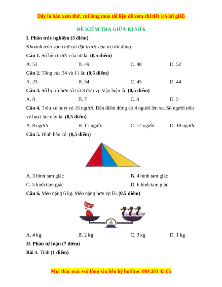 Câu 1. Số liền trước của 50 là: (0,5 điểm) A. 51 B. 49 C. 48 D. 52