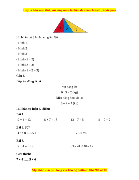 Hình bên có 6 hình tam giác. Gồm: - Hình 1 - Hình 2 - Hình 3 - Hình (1 + 2) - Hình (2 + 3) - Hình (1 + 2 + 3) Câu 6. Đáp án đúng là: A Vịt nặng là: 6 : 3 = 2 (kg) Mèo nặng hơn vịt là: 6 – 2 = 4 (kg)