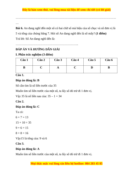 Vậy 35 là số liền sau của: 35 – 1 = 34 Câu 2. Đáp án đúng là: C Ta có: 6 + 7 = 13 15 + 10 = 35 9 + 6 = 15 8 + 8 = 16