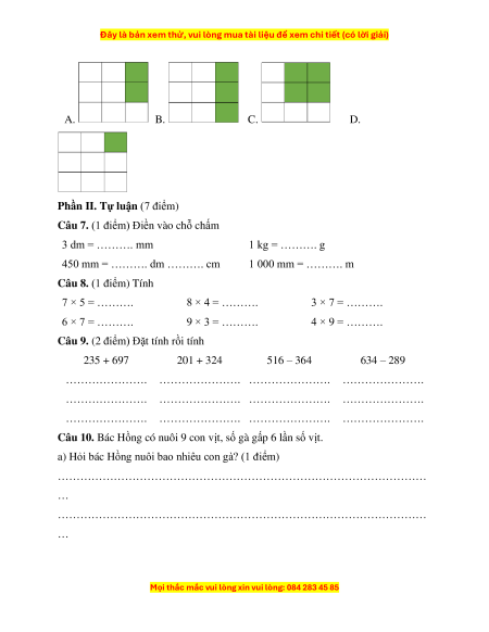 Câu 7. (1 điểm) Điền vào chỗ chấm 3 dm = ………. mm 1 kg = ………. g