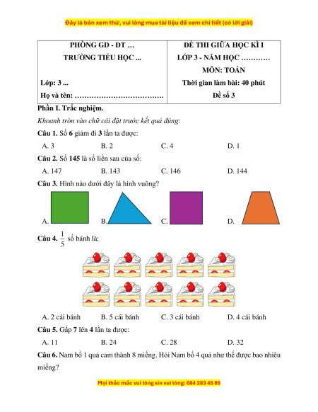 Câu 1. Số 6 giảm đi 3 lần ta được: A. 3 B. 2 C. 4 D. 1