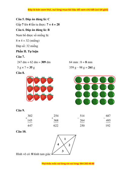 247 dm + 62 dm = 309 dm 64 mm : 8 = 8 mm 5 g × 7 = 35 g 359 g – 98 g = 261 g Câu 8. Câu 9. 302 + 254 + 514 − 687 − 145 368 264 495 447 622 250 192 Câu 10. 1 4 2 3