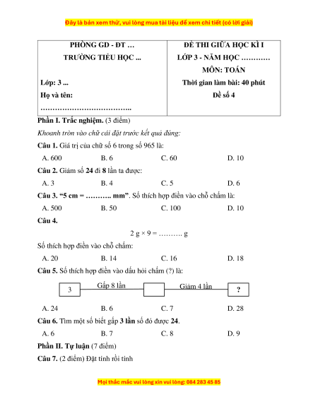 Câu 3. “5 cm = ……….. mm”. Số thích hợp điền vào chỗ chấm là: A. 500 B. 50 C. 100 D. 10 Câu 4. 2 g × 9 = ………. g