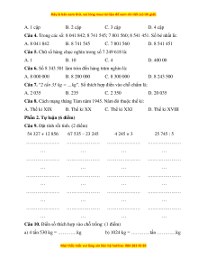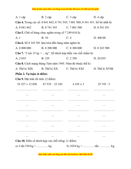Câu 9. Đặt tính rồi tính. (2 điểm) 54 327 + 12 856 67 535 – 23 245 4 245 × 3 25 745 : 5 ………………… ………………… ………………… ………………… … … … … ………………… ………………… ………………… ………………… … … … … ………………… ………………… ………………… ………………… … … … … ………………… ………………… ………………… ………………… … … … … ………………… ………………… ………………… ………………… … … … …