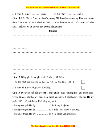Câu 11. Lúc đầu có 5 xe tải chở tổng cộng 210 bao thóc vào trong kho, sau đó có