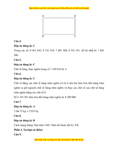 Câu 4. Trong các số: 8 041 842; 8 741 545; 7 801 560; 8 541 451. Số bé nhất là: A. 8 041 842 B. 8 741 545 C. 7 801 560 D. 8 541 451