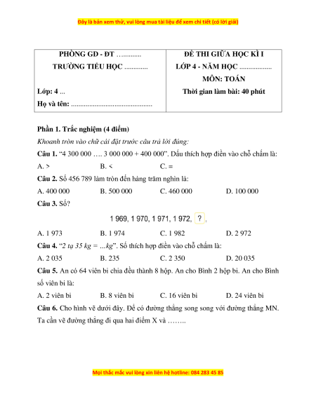 LỚP 4 - NĂM HỌC .................. MÔN: TOÁN Lớp: 4 ...