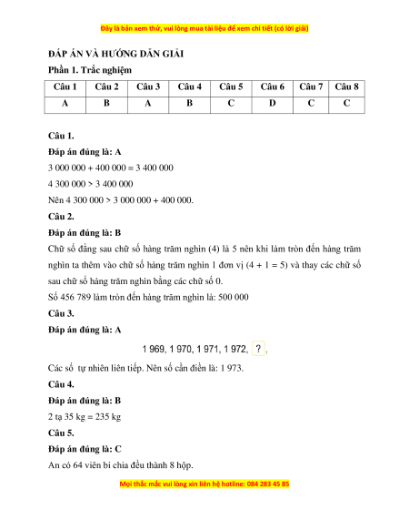 Câu 2. Số 456 789 làm tròn đến hàng trăm nghìn là: A. 400 000 B. 500 000 C. 460 000 D. 100 000 Câu 3. Số? A. 1 973 B. 1 974 C. 1 982 D. 2 972