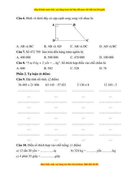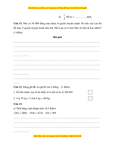 Câu 9. Đặt tính rồi tính. (2 điểm) 36 485 + 21 806 63 145 – 57 021 2 130 × 8 12 345 : 3 ………………… ………………… ………………… ………………… … … … … ………………… ………………… ………………… ………………… … … … … ………………… ………………… ………………… ………………… … … … … ………………… ………………… ………………… ………………… … … … … ………………… ………………… ………………… ………………… … … … …