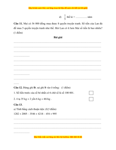 Câu 11. Mai có 56 000 đồng mua được 8 quyển truyện tranh. Số tiền của Lan đủ