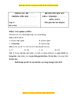 LỚP 4 - NĂM HỌC ..................... MÔN: TOÁN Lớp: 4 ...