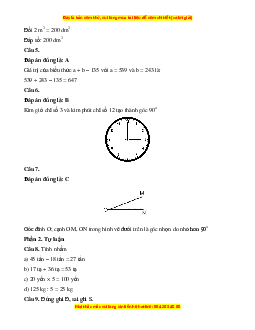 Câu 6. Góc tạo bởi hai kim đồng hồ khi đồng hồ chỉ 3 giờ là: A. 60o B. 90o C. 120o D. 180o