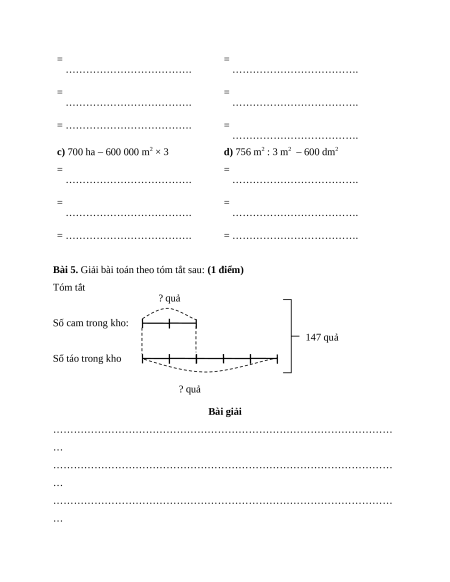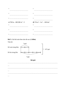 Bài 5. Giải bài toán theo tóm tắt sau: (1 điểm) Tóm tắt ? quả Số cam trong kho: 147 quả Số táo trong kho ? quả Bài giải