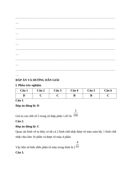 Giá trị của chữ số 5 trong số thập phân 1,05 là: Câu 2. Đáp án đúng là: C
