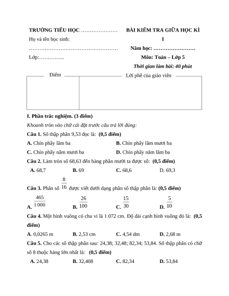 Câu 1. Số thập phân 9,53 đọc là: (0,5 điểm) A. Chín phẩy lăm ba