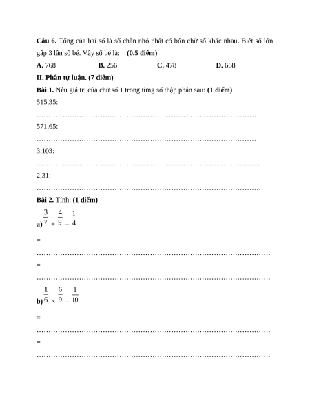 gấp 3 lần số bé. Vậy số bé là: (0,5 điểm) A. 768 B. 256 C. 478 D. 668