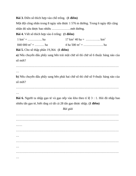Bài 4. Viết số thích hợp vào ô trống: (1 điểm) 1 km2 = ………….. ha