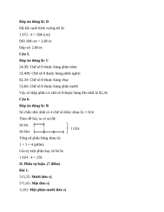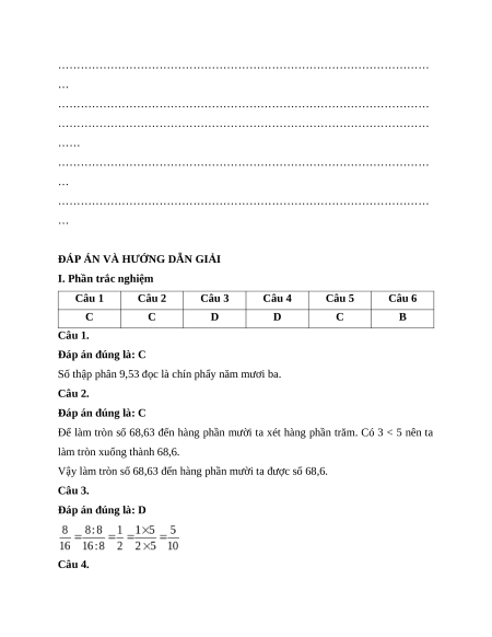 Vậy làm tròn số 68,63 đến hàng phần mười ta được số 68,6. Câu 3. Đáp án đúng là: D Câu 4.