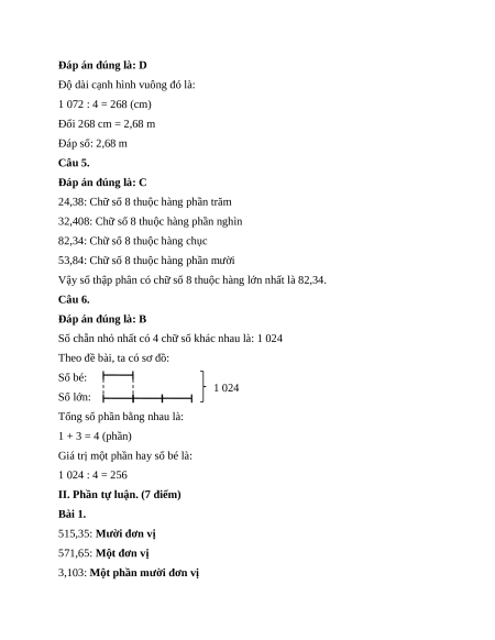 Câu 4. Một hình vuông có chu vi là 1 072 cm. Độ dài cạnh hình vuông đó là: (0,5 điểm) A. 0,0265 m B. 2,53 cm C. 4,54 dm D. 2,68 m