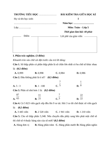 Câu 1. Số thập phân có phần thập phân là số chẵn lớn nhất có ba chữ số khác nhau là: (0,5 điểm) A. 0,999 B. 0,998 C. 0,984 D. 0,986
