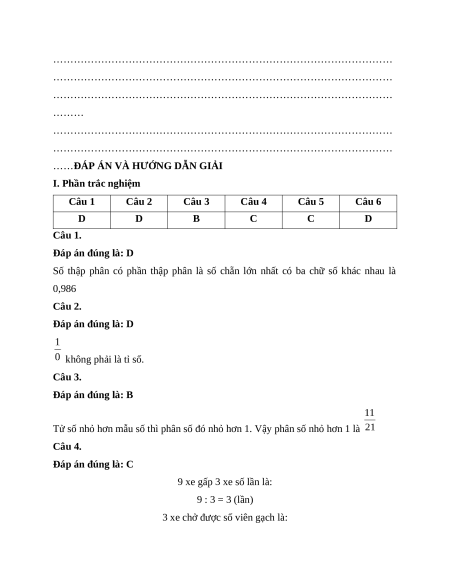 Số thập phân có phần thập phân là số chẵn lớn nhất có ba chữ số khác nhau là 0,986 Câu 2. Đáp án đúng là: D không phải là tỉ số. Câu 3. Đáp án đúng là: B