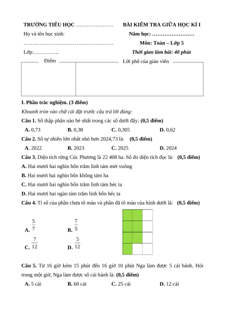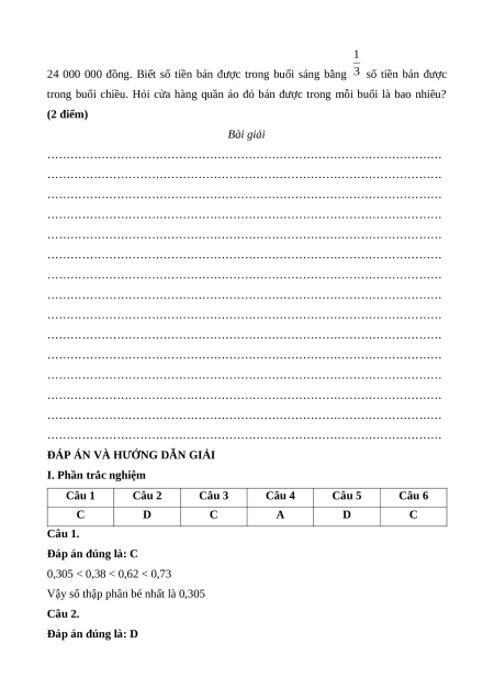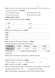 Câu 1. Số thập phân nào bé nhất trong các số dưới đây: (0,5 điểm) A. 0,73 B. 0,38 C. 0,305 D. 0,62