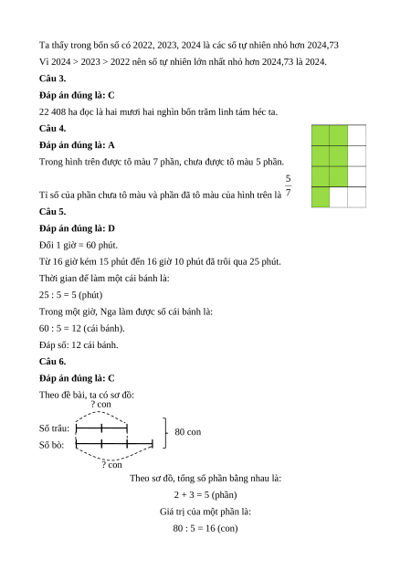Trong một giờ, Nga làm được số cái bánh là: 60 : 5 = 12 (cái bánh). Đáp số: 12 cái bánh. Câu 6. Đáp án đúng là: C