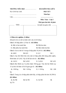 TRƯỜNG TIỂU HỌC ………………… BÀI KIỂM TRA GIỮA Họ và tên học sinh: HỌC KÌ I